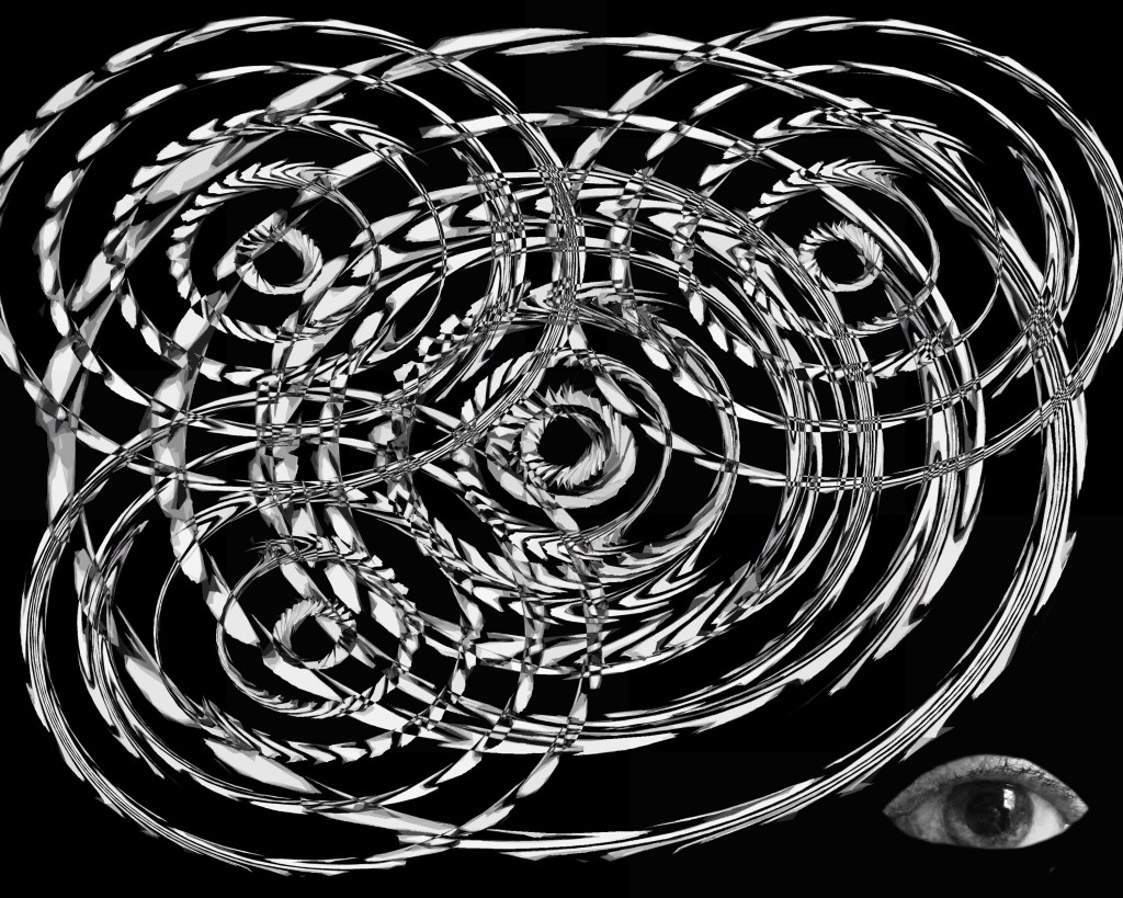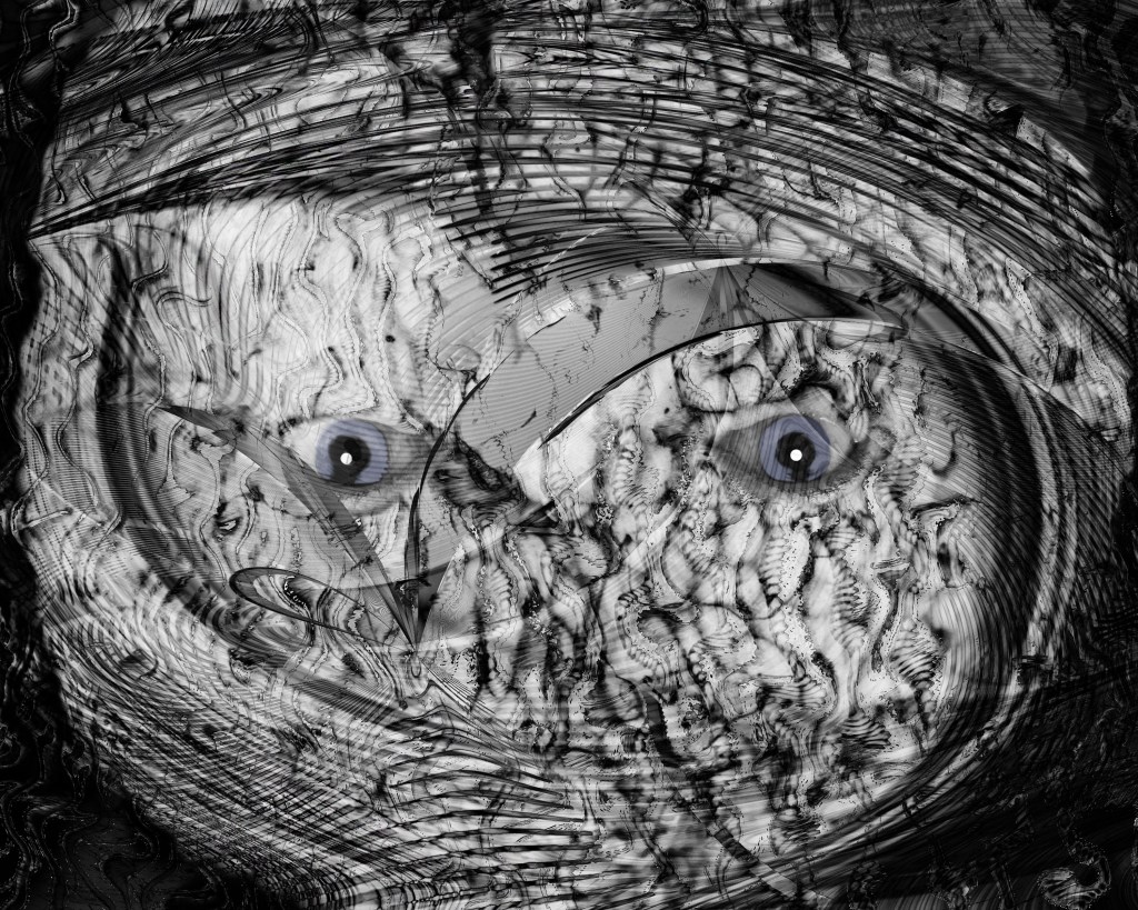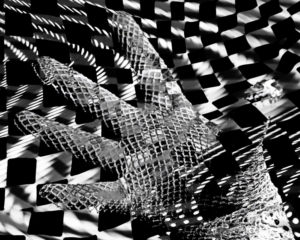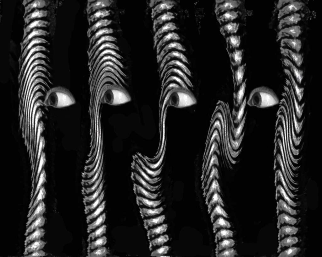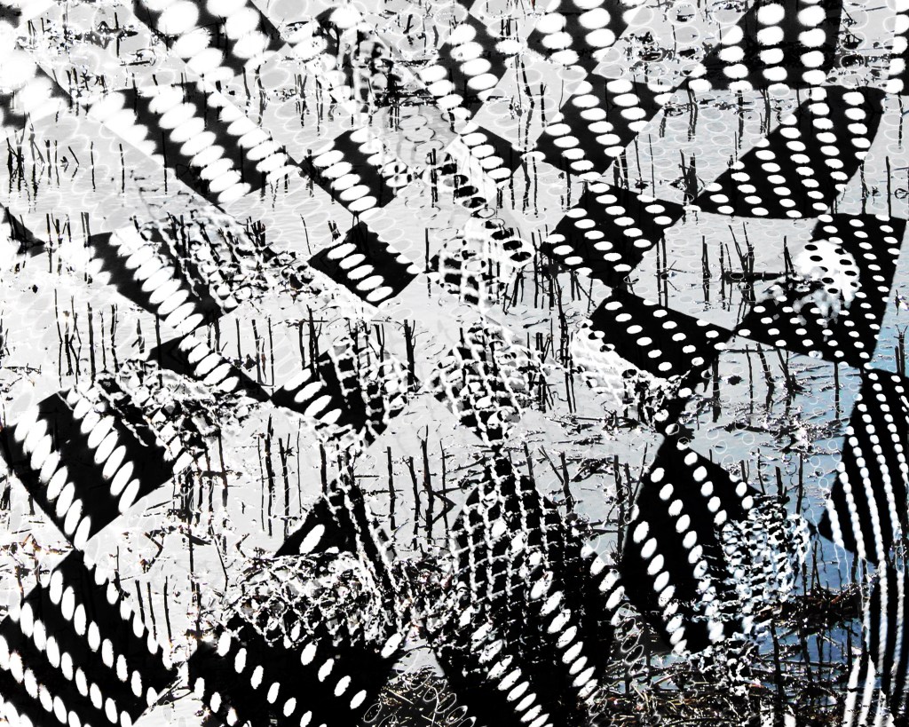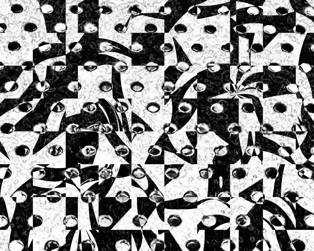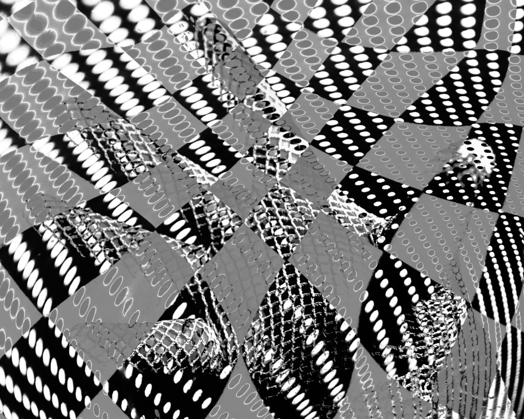 Comment on the new work: I’ve discovered a problem with the way I distort my photos. Each distortion removes the sharpness of the photograph. I have been going back through my various pattern photos and resharpening each. And there is a problem with intense color, as well. Intense colors tend to pixelate. I’ve been busy reworking both problems. Those problems only showed themselves on larger prints. The first two black and whites below may take ages to fix. I’ve been working with one newer worked combination which is still not complete at this date. I’m calling “Eyes”, so far. My goal is to enter various eyes into each black hole. The decision has not yet been made about the type of eyes. And the blending in of each eye needs to be closer to the black and white background. At least, I’m learning more about the digital side of photography. I’m also very aware that there is a down side to using film that is then digitalized. But even that is improving with each use. The down side is that I can’t just createan image by playing around with it’s combinations but need to pay attention to each distortion, each intense color use, each blending of images, etc. And that takes a lot more time. So, please, be patient for new work.