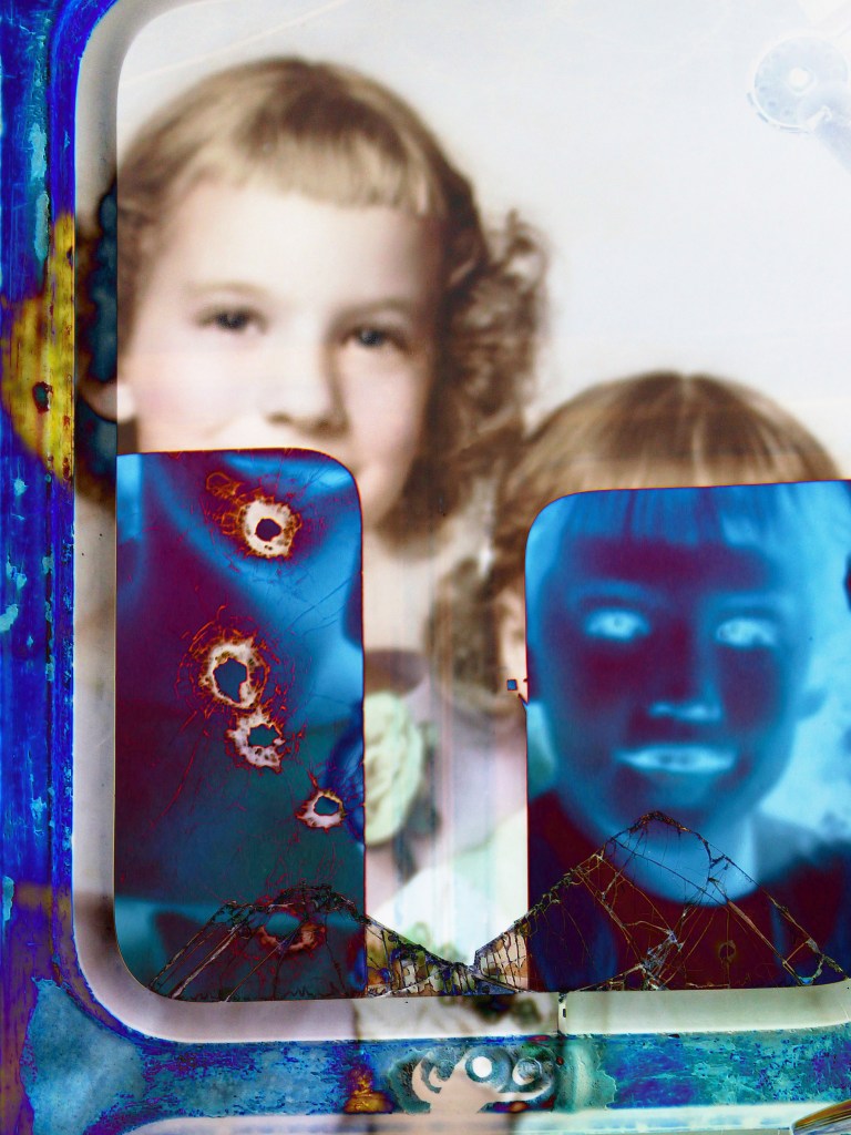 As a family we moved to Florida for my mental health. I needed to relax. I dropped out of school but took courses to get my GED. The last course I took was an art class. I lucked out! Mr. Miller had been an apprentice under Norman Rockwell. I was so frustrated by the movement of the sun while drawing. Mr. Miller urged me to get a good camera. He told me I had talent and needed to go on in school. I dropped back in for college with a Minolta SLR. I attended the local community college, then the University of South Florida. In my first photography class I had a light bulb burst in my head while rolling film onto a reel – this is my medium! I took class after class in photography until there weren’t any more. Professor Oscar Bailey signed off for me to take a master’s level course. In that course I created my first show, Greek Mythology: Through the Titans. The show was the last week of my senior year. I was offered $1500 for the entire show. I, lacking belief in myself and my work, turned the man down. However, a medical student came in and asked me if I knew what the arrow in the brain was pointing to. It was the Greek goddess Mnemosyne, the goddess of memory. The brain was combined with a family picture. My dad was the central figure. He told me the arrow pointed to a brain tumor. My dad died when a brain tumor burst in his head. Art became a way to deal with all that mourning!